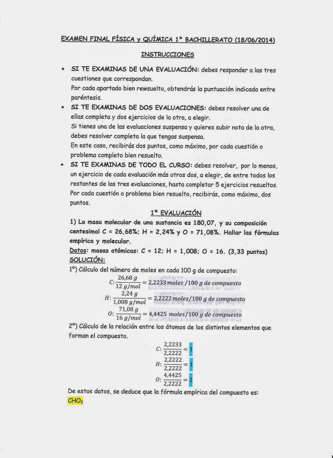 EXAMEN FINAL JUNIO FÍSICA Y QUÍMICA 1º BACHILLERATO RESUELTO